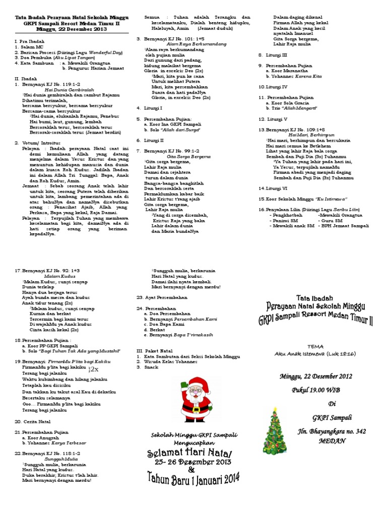 Memberi sukacita kepadamu, di malam kudus ini, sepanjang perayaan natal. Persiapan perayaan natal dibutuhkan beberapa minggu sebelum acara tersebut di laksanakan, salah satunya adalah penyusunan lagu lagu mulai a. Liturgi natal sekolah minggu hkbp solo 2014. Hari ini telah lahir bagimu juruselamat, yaitu kristus tuhan di kota daud tuhan, jika aku boleh bertanya. Penampilanmamahku tergolong seperti anak muda, sebagai wanita yang tinggal di kota besar.